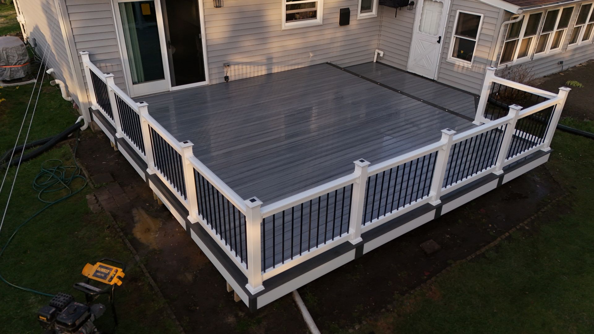 This project in Cinnaminson, NJ features a modern composite deck with a clean two-tone look—gray decking paired with a darker border for a sharp, finished feel.