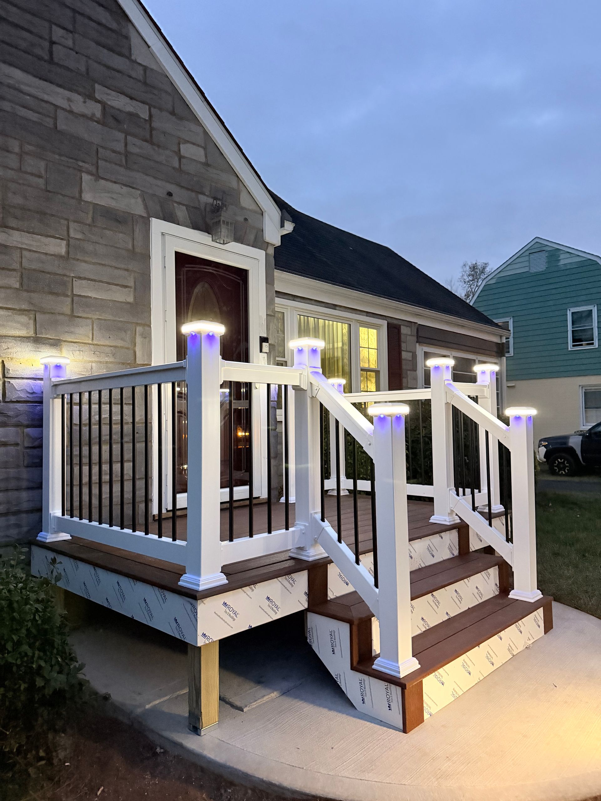 Prestige Construction & Solutions was designed to refresh the home’s entrance with a clean, well-balanced look. The porch features durable decking and crisp trim that give it a neat, welcoming feel. Custom steps improve everyday access, and the railing adds both safety and a subtle modern touch without overpowering the design.
