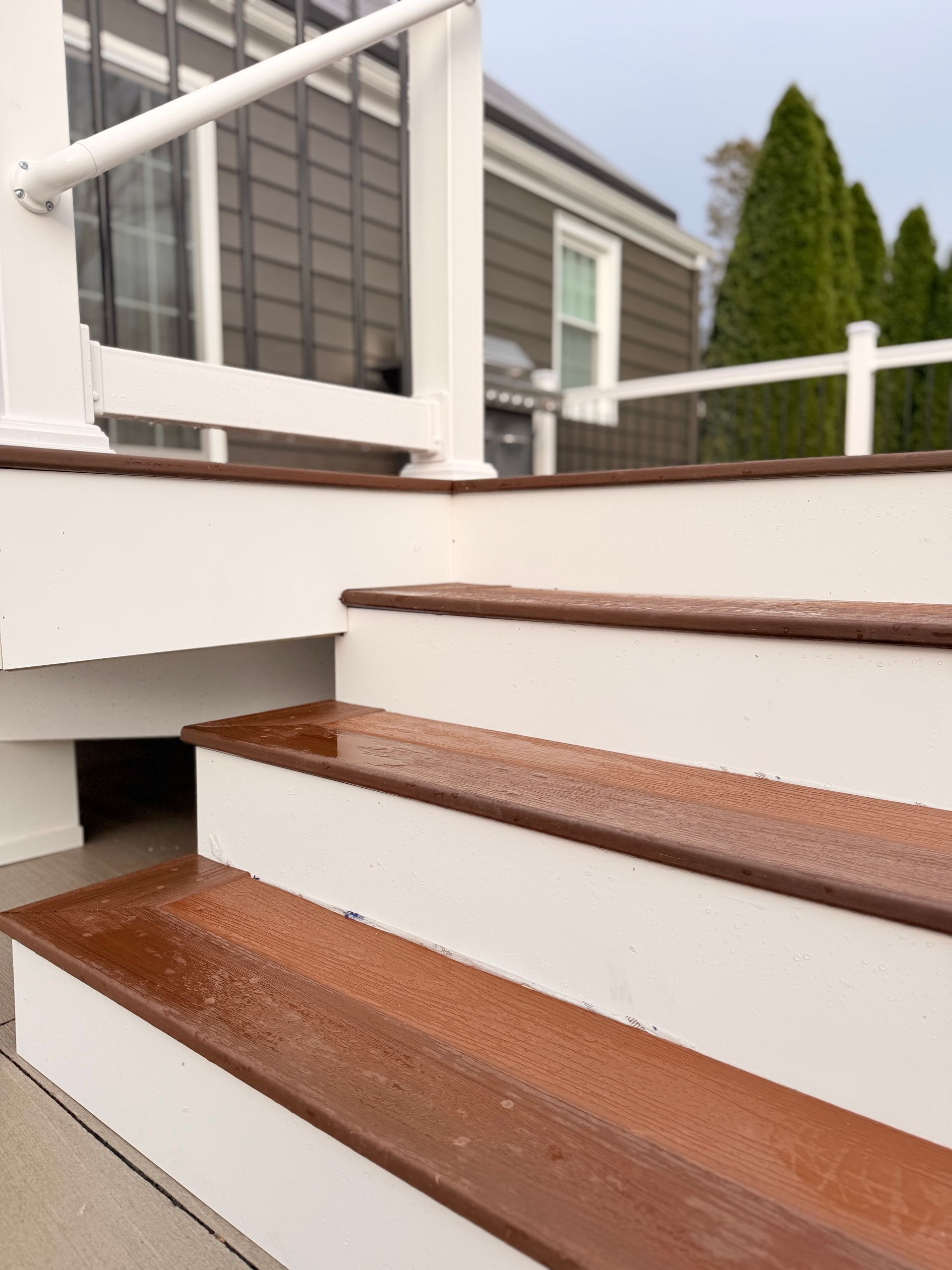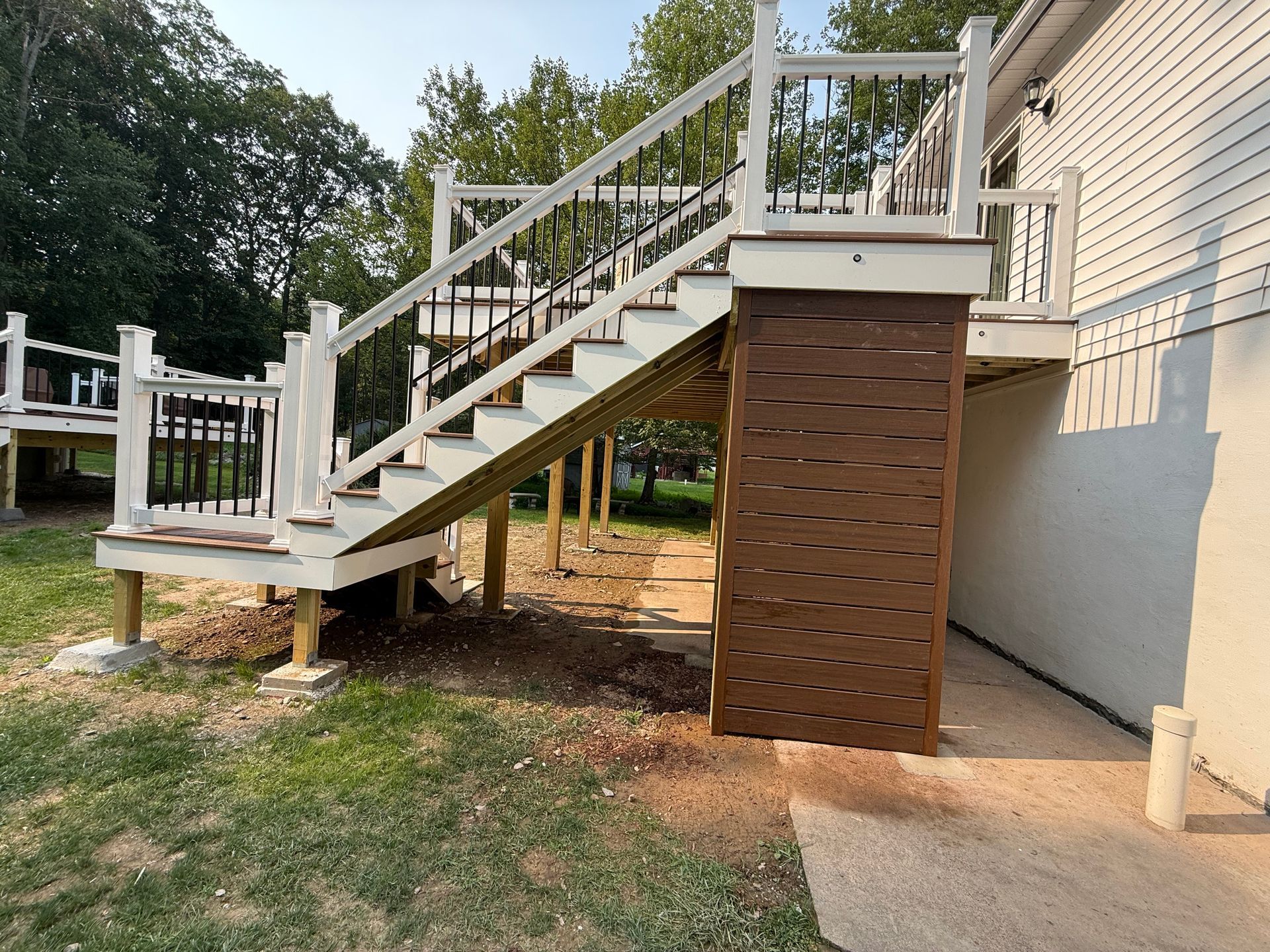 This beautiful elevated deck in South Orange, NJ showcases a perfect blend of composite decking boards and low-maintenance PVC railings. Designed for both durability and style, it features a two-tone finish that highlights the clean white posts and rich brown deck surface.